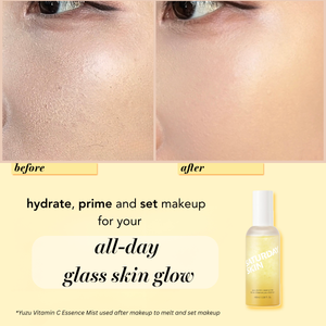 This dual-texture jelly essence mist bursts with brightening Yuzu Vitamin C, vegan Phyto-mucin, Hyaluronic Acid, Ceramides and Peptides to instantly hydrate, plump, and refresh skin. Use as a fine mist or press in as an essence for a dewy, glass-skin glow—before skincare or makeup, after makeup, or whenever your radiance needs a extra boost of glazed skin glow. ✨
